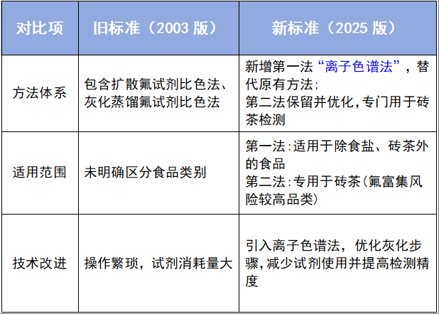 《食品中氟的測定》(GB/T 5009.18—2003)作為推薦性國家標準實施多年后,現升級為具有強制效力的《食品安全國家標準 食品中氟的測定》(GB 5009.18-2025),新舊標準區別如下: